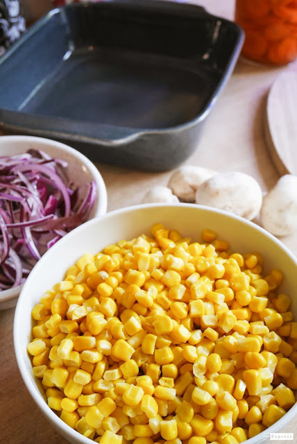 Ensuite j'ai recouvert mon plat à gratin de papier sulfurisé et j'ai fait des couches avec ma préparation de maïs, ensuite une couche de légumes / émincés, je saupoudre de la levure nutritionnelle pour la touche cheesy.